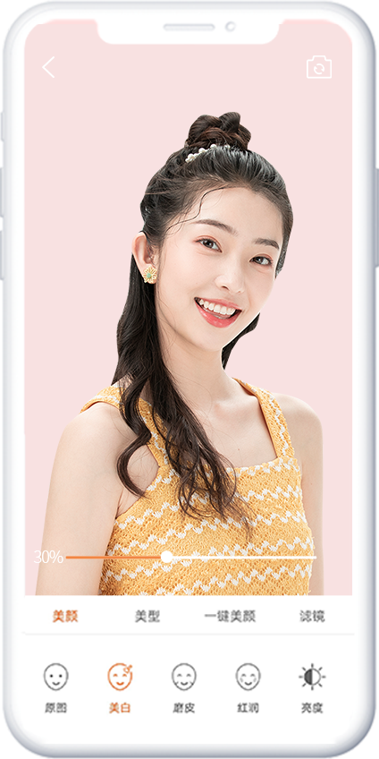 自由调节美颜效果,全局美化体验,支持多级调节,包含美白、磨皮、红润等。